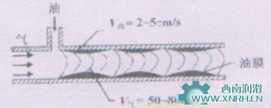油气润滑的机理,如图4所示。以步进式给油器,定时定量间断地供给润滑油,用3~4×105Pa的压缩空气,沿油管内壁将油吹响润滑点,将油品准确地供应到最需要润滑的润滑部位。油气润滑与油雾润滑虽然都是两相流,但在流体性质上截然不同。油雾润滑时,油被物化成0.5~2μm的雾粒,物化后的油,随空气一同前进,二者的流速相同;油气润滑时,油不被雾化,油是以连续油膜的方式被导入润滑点,并在润滑点处,以精细油滴方式,喷射到润滑部位。在油气润滑中,润滑油的流速为2~5cm/s;而空气速度为30~80m/s,特殊情况可高达150~200m/s。